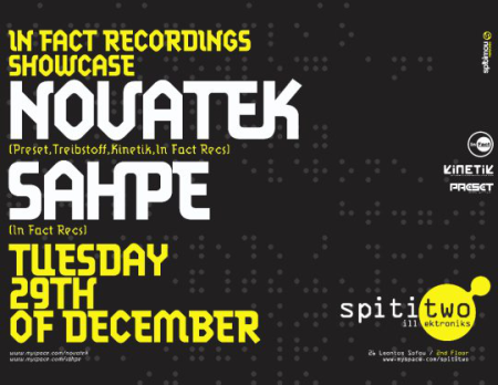 After his release on In Fact Recordings, Sahpe was quite looking forward to the opportunity to DJ along Novatek (In Fact head honcho), and this was a dream-come-true! On 29th December 2009 they hosted an In Fact Recordings label showcase!
