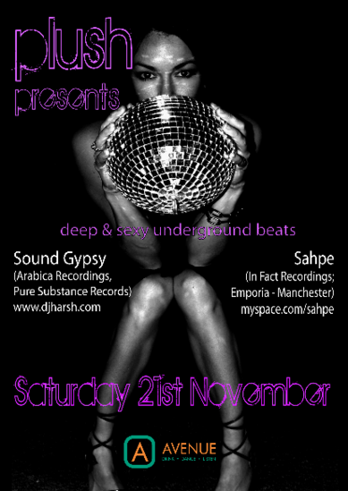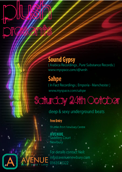 The renovated Avenue in Newbury, UK, had just opened its doors and since it was the newest and finest club in town, Sound Gypsy and Sahpe took it upon themselves to get Newbury dancing! PLUSH was named after feel of the venue and the music that the night would offer... The first night was on 24th October 2009 and opened up an opportunity for more to come!