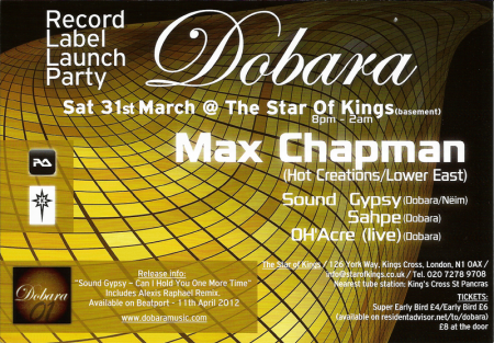 The Dobara Label Launch was headlined by none other than mister Max Chapman (Hot Creations/Lower East) at The Star of Kings. Plenty of bass driven deep house and nu disco did justice to the Funktion One sound system in the Rave Cave (basement)! Sahpe had already signed a track for a forthcoming release and was therefore invited to warm up for label manager Sound Gypsy!
